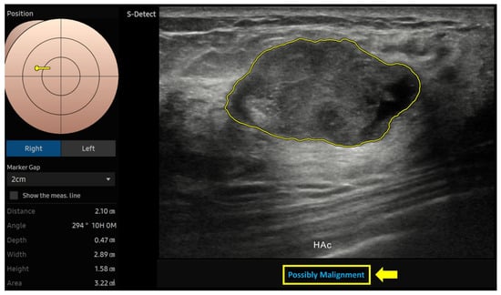 An AI-generated region of interest (ROI) was delineated around the mass’s border. S-Detect automatically extracted and displayed ultrasound features based on the ultrasound BI-RADS lexicon. The final determination based on the high-accuracy (HAc) mode was categorized as either “possibly benign” or “possibly malignant” (arrow).