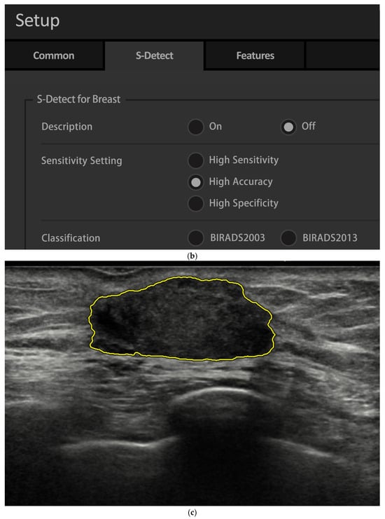A previous study evaluating the impact of Koios DS CADx software (v1.3, Koios Medical, Inc., Chicago, IL, USA), including the original, high-sensitivity, and high-specificity modes, on breast ultrasound interpretation demonstrated that while the original CADx interpretation did not significantly influence the diagnostic performance, the high-specificity mode enhanced radiologists’ accuracy and efficiency [9]. S-Detect also provides three selectable modes: high-sensitivity (HSe), high-accuracy (HAc), and high-specificity (HSp). The HAc mode, which balances sensitivity and specificity, is the most commonly used mode in S-detect research [10,11]. As an AI-assisted ultrasound system, S-Detect with the HAc mode has demonstrated promising efficacy in breast cancer detection [10,11].