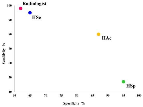 Comparative analysis of diagnostic performance between radiologists and three AI modes: HSe, HSp, and HAc (n = 260).