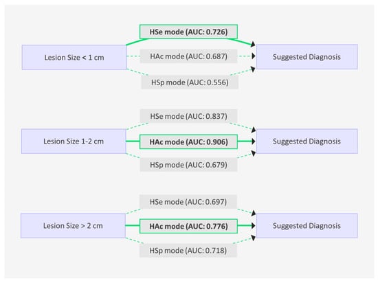 Considering the lesion size, the HSe mode exhibited the highest AUC (0.726) for lesions smaller than 1 cm. For lesions ranging from 1 to 2 cm, the HAc mode achieved an AUC of 0.906, and for those larger than 2 cm, it recorded an AUC of 0.776, maintaining its superior diagnostic performance across lesion sizes.