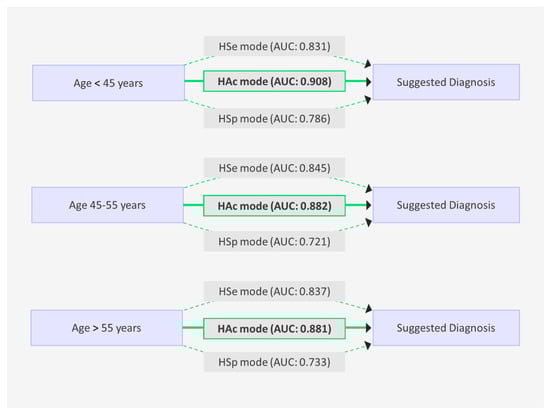 The HAc mode consistently outperformed the other modes across all age categories. For women under 45, the HAc mode achieved an AUC of 0.908 (95% CI: 0.83, 0.96), whereas the HSp mode lagged behind with an AUC of 0.786. In women aged 45–55, the HAc mode continued its superior performance, registering an AUC of 0.882 (95% CI: 0.79, 0.95), compared to the HSp mode’s AUC of 0.721. For women aged 55 and above, the HAc mode recorded an AUC of 0.881, while the HSp mode had an AUC of 0.733.