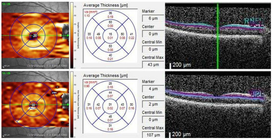 In addition, two senior ophthalmologists blindly classified and delineated all EDI-OCT images as per the proposed protocol. The SFCT was manually quantified as a vertical distance from the outer surface of a hyper-reflective line denoting the RPE and Bruch’s membrane complex to a hypo-reflective line denoting the sclero-choroidal interface centered on the fovea using a measuring tool with an integrated linear caliber. The average SFCT was calculated by averaging two blinded ophthalmologists’ SFCT measurements at the fovea as well as at 1500 and 3000 µm nasal and temporal distances from the foveal center. In addition, the device review software automatically segmented GCL and IPL with manual processing and correction as needed. The segmentation quality was thoroughly reviewed and any errors were corrected immediately. The GCL and IPL thickness measurements were recorded directly from the review software and the co-localized GCL and IPL thicknesses were added together manually to determine the GC-IPLT (Figure 1) [24].