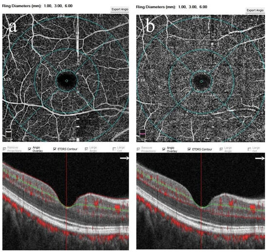 The percentage of pixels in a particular region covered by vessels and microvasculature was used to automatically quantify the VDs, which were determined using a 6 × 6 mm2 macular angiogram of the whole, foveal, parafoveal, and perifoveal SCP and DCP. While the SCP angiogram had an inner boundary 3 µm beneath the internal limiting membrane and an outer boundary 16 µm beneath the IPL, the DCP angiogram had an inner boundary 16 µm beneath the IPL and an outer boundary 70 µm beneath the IPL (Figure 2) [25].