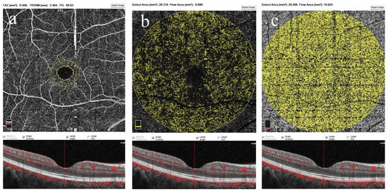 The foveal avascular zone (FAZ) is typically a significant zone devoid of flow signal on an en face macular angiogram. This zone was analyzed automatically using FAZ mode software to determine parameters, including the FAZ area (mm2), FAZ perimeter (mm) and foveal VDs in a 300-μm wide region surrounding FAZ (FD-300) (%). Further, a maximum circular area that could be captured by the fovea-centered image section with a radius of 2.97 mm was manually created in the outer retinal and choriocapillaris layers. The outer retinal layer was located 70 μm beneath the IPL and 30 μm beneath the RPE. The AngioVue software calculated the outer retinal flow automatically as the percentage of vessel area covered in the selected area centered on the FAZ. The choriocapillaris layer was located between the RPE and deeper layer, with RPE offsets of 31 µm and 59 µm, respectively. Using Optovue software with a flow function, the choriocapillaris flow was calculated automatically by dividing choriocapillaris vessel areas by selected area (Figure 3) [26].