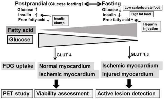 FDG uptake in the myocardium is dependent on a cardiac energy substrate, either glucose or fatty acids, depending on postprandial or long fasting conditions [12,13] (Figure 1). FDG PET is applicable for any patient. In addition, whole-body imaging is available once FDG is administered. Thus, such whole-body studies are commonly used in studies in oncology and generalized inflammatory diseases. Glucose is the major energy source in the myocardium under postprandial or glucose loading conditions. Under these conditions, FDG uptake is seen in both the normal and ischemic myocardium. In fasting conditions, on the contrary, glucose energy metabolism is suppressed in the normal myocardium. FDG uptake is seen only in the ischemic and/or injured myocardium. Therefore, patient preparation before FDG administration is quite important since FDG uptake in the myocardium is observed as either physiological uptake or abnormal active uptake, depending on the patient’s nutritional condition [12,13,14,15,16,17,18]. Our study indicated that plasma free fatty acid (FFA) was a suitable marker to predict the suppression of physiological FDG uptake in the myocardium [13]. FFA was a better marker for such a prediction than either plasma glucose or insulin under a >18 h long fasting condition with or without the use of heparin administration.