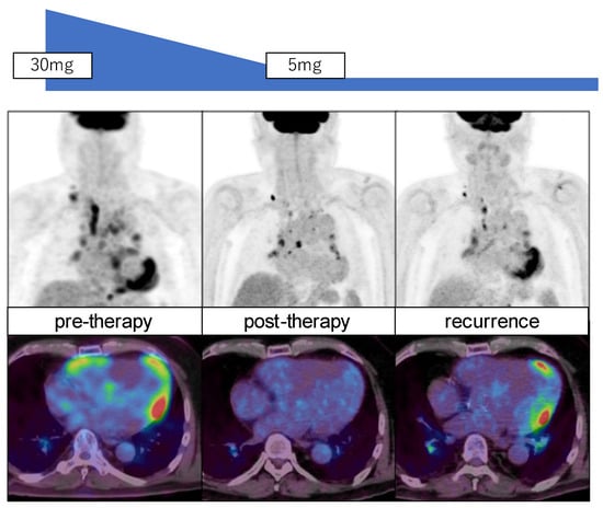 FDG PET is commonly used to assess the cellular infiltration of sarcoidosis in the myocardium. Since FDG uptake reflects the expression of glucose transporters, increased FDG uptake may reflect active inflammatory cells, such as macrophages, lymphocytes, and granulocytes. Thus, active sarcoid lesions may be nicely shown as focal FDG uptake in the myocardium as well as in other active sarcoid lesions in the body. Patient preparation is required, such as prolonged fasting, a low-carbohydrate diet, and/or a high-fat, high-protein diet to suppress physiological myocardial FDG uptake [29,30] (Figure 1). When plasma FFA is not high enough under regular fasting conditions, heparin administration may help to increase plasma FFA levels and suppress physiological FDG uptake in the myocardium. FDG PET, with an adequate preparation protocol, is ideal for detecting active myocardial lesions. When evaluating cardiac sarcoidosis, it is important to assess not only the extent of FDG uptake but also its location. The involvement of specific myocardial segments, particularly the basal to mid-anterior and mid-septal segments, is associated with higher event rates in patients with suspected cardiac sarcoidosis [31]. FDG PET is also valuable for assessing the response to anti-inflammatory therapy in patients with cardiac sarcoidosis [32,33,34,35,36]. Figure 3 illustrates a typical example indicating high FDG uptake in cardiovascular regions, which also disappeared after steroid therapy. The FDG uptake reappeared upon follow-up, suggesting a recurrence of the sarcoidosis. Thus, FDG PET is valuable for detecting active cardiovascular lesions and for monitoring treatment effects. Furthermore, FDG PET has potential for predicting patient outcomes [34,35].