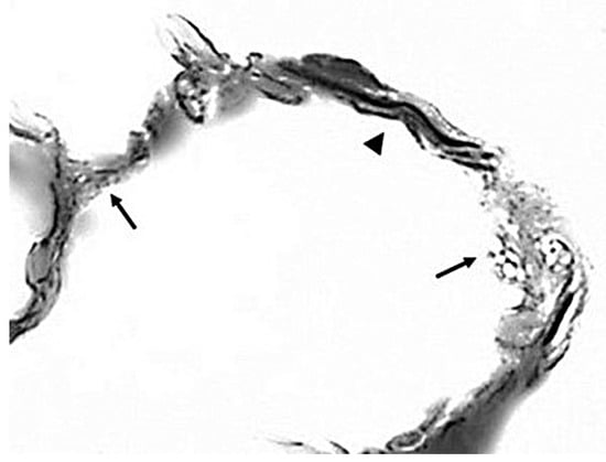 - Fagiola, M.; Reznik, S.; Riaz, M.; Qyang, Y.; Lee, S.; Avella, J.; Turino, G.; Cantor, J. The relationship between elastin cross linking and alveolar wall rupture in human pulmonary emphysema. Am. J. Physiol. Cell. Mol. Physiol. 2023, 324, L747–L755. [Google Scholar] [CrossRef]