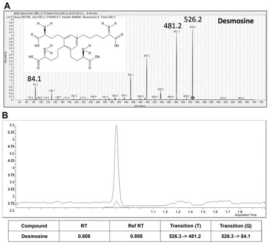 (A) Mass spectrometry profile showing the transitional ions used to identify desmosine. These ions result from the exposure of the chromatographically separated DID to a high-energy electromagnetic field. (B) The large chromatographic peak consists of DID derived from formalin-fixed tissue sections. The smaller coeluting peak is a deuterium-labeled DID standard used to identify the composition of the main peak. Reprinted with permission from [19].
