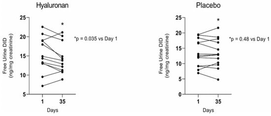 Free urine DID was significantly decreased following a 28-day clinical trial of inhaled HA in patients with alpha-1 antitrypsin deficiency-induced COPD. Measurements were made one week after the completion of treatment. No significant difference was seen in the placebo group. The findings are consistent with the experimentally demonstrated effect of HA in preventing elastic fiber degradation. The paired t-test was used to determine statistical significance (p < 0.05). Reprinted with permission from [45].