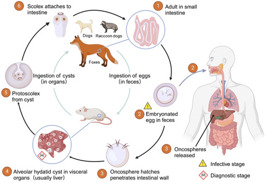- Vuitton, D.A.; Gottstein, B. Echinococcus multilocularis and its intermediate host: A model of parasite-host interplay. J. Biomed. Biotechnol. 2010, 2010, 923193. [Google Scholar] [CrossRef]