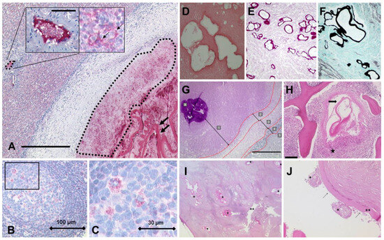 E. multilocularis lesion in human liver tissue. Bar = 750 µm; bar insert = 40 µm (A); arrow (right): laminated layer; arrow (in the insert): specific staining in lymphoid tissue of a regional lymph node on the surface of cells [76]. Immunohistochemical staining with the Em2G11 antibody detects numerous spems in the follicle and the perifollicular area of a lymph node with E. multilocularis (spems) involvement (B,C) [77]. Hematoxylin–eosin (H&E) staining shows microcystic structures lined by a laminated grayish membrane on a background of necrosis (D), and staining with Gomori methenamine silver (GMS) and Periodic acid−Schiff (PAS) further highlights the laminated membranes (E,F) [78]. Examples of histological analyses of liver alveolar echinococcosis infections. Sections were stained with PAS (G) [79]. Parasite membrane (arrow) of the larval stage of E. multilocularis, with surrounding non caseating granuloma (star). Scale bar = 200 µM (H) [80]. The histology of the explanted liver showing the laminated layer of E. multilocularis (*) in close proximity to a large bile duct (**) in the hepatic hilus region (I). Magnification of a metacestode. Remnants of two protoscolices (*), the laminated layer (**), and the delicate germinal layer (arrows) are shown (J) [81].