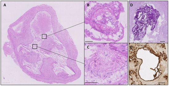 H&E staining shows overview section (A) with marked areas magnified (B,C). PAS stain (D) and Em2G11 immunohistochemistry (E). Scale bars = 1 mm (A), 20 μm (B,C), and 100 μm (D,E) [82].