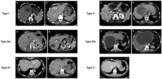 Besides the US, computed tomography (CT) is presently the preferred diagnostic imaging among the available methods, as it is capable of detecting the highest number of lesions and clearly distinguishing characteristic calcifications [111,112]. Abdominal CT is more suitable for identifying calcifications and preoperative assessment. CT scan primarily relies on the determination of lesion size, rather than on the accurate assessment of AE proliferation and infiltration activity. In 2016, Graeter et al. [113] proposed five classifications for CT imaging of hepatic alveolar echinococcosis (Figure 5). Type I: diffuse infiltrating, Type II: primarily circumscribed tumor-like, Type III: primarily cystoid, Type IV: small-cystoid/metastatic, Type V: mainly calcified. After conducting a retrospective analysis of 228 patients with hepatic alveolar echinococcosis, they revealed that the most frequently encountered CT morphological pattern was the diffuse infiltration pattern (Type I), followed by the primarily circumscribed tumor-like appearances (Type II). The mainly calcified appearance (Type V) was observed less frequently. The E. multilocularis Ulm classification for computed tomography (EMUC-CT) offers the basis for the systematic description of the CT morphology of AE lesions of the liver [114]. A study has shown that there is a close correlation between the patterns of AE according to the EMUC-CT classification and the different histological patterns of AE infections [79]. The CT types mark consecutive stages of infection, which progress over time. The classification of calcifications in AE observed on CT is shown in Figure 6.