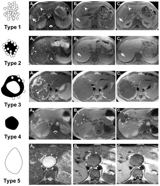 Schematic shows classification scheme of MR findings of alveolar echinococcosis in the liver by Kodama et al. [133] Type 1: multiple small round cysts without a solid component; Type 2: multiple small round cysts with a solid component; Type 3: a solid component surrounding large and/or irregular cysts with multiple small round cysts; Type 4: a solid component without cysts; Type 5: a large cyst without a solid component. Transverse MR images show Type 1–5 lesions. T2-weighted images (A), T1-weighted images (B), and contrast-enhanced T1-weighted images (C) obtained from MRI and shown the lesions (arrowheads). These arrows point to the diseased tissue.