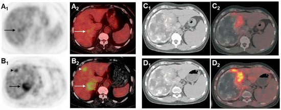 Standard PET acquisition (A1) and PET/CT acquisition (A2). Delayed PET acquisition (B1) and PET/CT acquisition (B2) [153]. The images acquired through delayed acquisition are clearer, showing a lesion that is visible only in delayed acquisition. Early image acquisition at 1 h after FDG injection (C1,C2) and delayed image acquisition at 3 h after FDG injection (D1,D2) significantly enhanced images of FDG uptake, with an increase in SUV value [34].