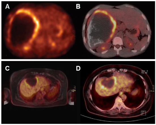 A doughnut sign of hepatic alveolar echinococcosis on FDG PET/CT (A,B) [154]. FDG-PET/MRI (C) and FDG-PET/CT (D) scan of a patient with alveolar echinococcosis [162]. The characteristic metabolic appearance is associated with peripheral hypermetabolic rims induced by inflammation and central hypometabolic areas resulting from necrosis.