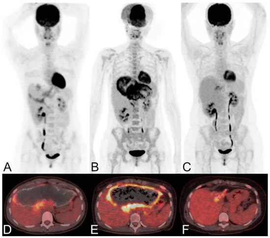 Long-term dynamic PET/CT monitoring of a female patient with alveolar echinococcosis exhibiting large liver manifestations [171]. The patient was 24 years old in 2005 (maximum intensity reconstructions of PET (A) and fused PET/CT images (D)), 32 years old in 2012 (B,E), and 40 years old in 2020 (C,F). She has been treated with albendazole since 1997, and therapy was ongoing at the last clinical follow-up in 2021.