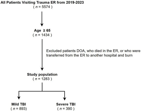 A total of 5574 patients with multiple traumas visited our regional trauma center between 2019 and 2023. Among them, 1434 patients were aged ≥65 years. After excluding ineligible patients, 1283 elderly adults with multiple traumas met the inclusion criteria. These patients were categorized into two distinct groups: mild TBI (head AIS ≤ 3, n = 893) and severe TBI (head AIS ≥ 4, n = 390) (Figure 1).