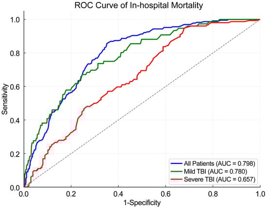 For all patients (n = 1283), the mean GTOS was 126.9 ± 31.9 and the observed in-hospital mortality rate was 17.9% (n = 230), which closely aligned with the GTOS-predicted risk of 17.6%. The overall in-hospital mortality rate for all geriatric trauma patients, including those with TBI of any severity, was 17.9% (n = 230), similar to the model-predicted mortality rate of 17.6%. The AUC for all patients was 0.798 (95% CI: 0.770–0.825). When stratified by head AIS, the mild TBI group (n = 893) had a mean GTOS of 117.0 ± 27.6 and an observed in-hospital mortality of 8.4% (n = 75), compared with a predicted mortality of 12.8%. The AUC in this group was 0.780 (95% CI: 0.715–0.821). Conversely, the severe TBI group (n = 390) had a higher observed mortality of 39.5% (n = 154) relative to the predicted risk of 28.8%, with a mean GTOS of 149.6 ± 29.4. The AUC for severe TBI was 0.657 (95% CI: 0.603–0.710) (Table 2). When analyzing mortality rates according to head AIS thresholds (≥1 to ≥5), we found that the gap between observed and predicted mortality rates widened as the level of severity increased. Although the model prediction closely matched the observed rate for the entire cohort (17.6% vs. 17.9%), this discrepancy increased at higher head AIS levels. For instance, at head AIS ≥ 4, the observed mortality of 39.5% notably exceeded the predicted 28.8%, and among patients with head AIS ≥ 5, the gap became even more pronounced (50.9% vs. 35.3%). These findings indicate that the model systematically underestimated the mortality risk in patients with increasingly severe head injuries (Supplementary Table S1). Figure 2 illustrates the ROC curves for all elderly patients with multiple traumas (blue), mild TBI (green), and severe TBI (red). In the ROC curves, elderly patients with multiple traumas and mild TBI exhibited a level of discriminative ability comparable to that of all patients, whereas it was reduced in those with severe TBI.