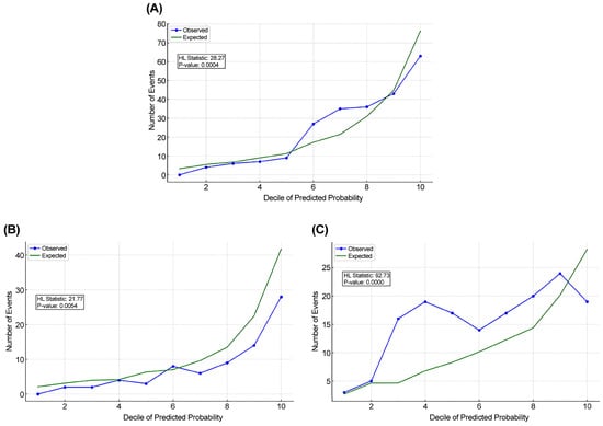 Hosmer–Lemeshow goodness-of-fit plots for predicted mortality in elderly patients with TBI and multiple traumas, including all patients (A), those with mild TBI (B), and those with severe TBI (C).