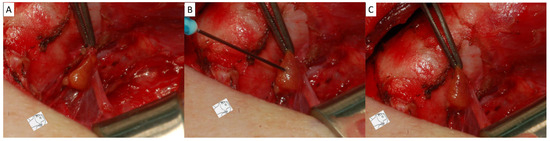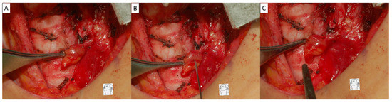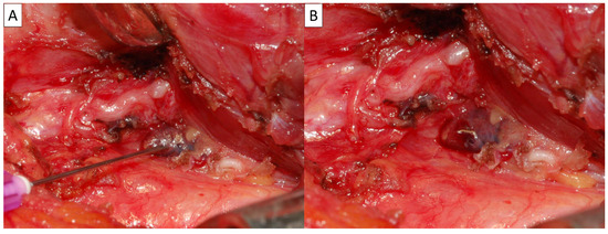 When performing the stabbing test, a needle or blade can be used. In this study, we routinely assessed the vascular supply of exposed PGs by stabbing test with a 23G needle. If fresh blood oozed after stabbing the gland, the PG was considered viable and preserved in situ. Even if the PG color became dark and black, we preserved it in situ after a positive stabbing test (Figure 4A,B). Promberger et al. [23] also did not support autotransplantation as a generally applicable first-line intervention for discolored PGs in the absence of other criteria for autotransplantation, claiming that the function of discolored PGs is only transiently impaired and recovers within a short time after surgery. The PG is considered non-viable if no fresh blood is oozing out after repeated stabbing, or if there is only old, congested bleeding without fresh blood. The PG was then cut piece by piece from the distal end to confirm the complete loss of vascular supply and was autotransplanted into the muscle pocket. With this PG management strategy, 434 patients (82.2%) had iPTH ≥ 15 pg/mL, 65 patients (12.3%) had iPTH between 4 and <15 pg/mL, and 29 patients (5.5%) had iPTH < 4 pg/mL at PO-D1. At PO-12M, 527 patients (99.81%) had iPTH ≥ 15 pg/mL, 1 patient (0.19%) had iPTH between 4 and <15 pg/mL, and 0 patients had iPTH < 4 pg/mL. Although five patients (0.95%) developed PG insufficiency and required long-term use of calcitriol or calcium supplementation, the results can be considered as a good long-term outcome of PG function compared to the literature. Several studies with respect to the application of ICG angiography also showed good results in patients, with one well-perfused PG preserved in situ [25,26,27]. However, compared with ICG angiography, the PG stabbing test is a simpler, more useful, and more cost-effective way to assess PG vascular supply and viability. The new technology of near-infrared autofluorescence may be valuable and helpful for PG identification and preservation [24,36]. In addition, a thorough understanding of PG anatomy and surgical techniques is also important for preserving PG function [37].