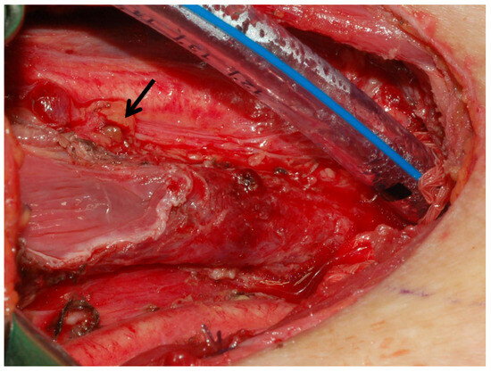 The patient underwent total thyroidectomy and total laryngectomy. Only one PG (↑) following a positive stabbing test was preserved in situ. Transient postoperative hypoparathyroidism occurred, but the patient recovered quickly during subsequent follow-up.