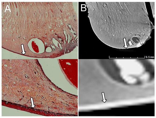 The vaginal mucosa covering the uterine cervix. The vaginal mucosa and its stratum corneum are visible (arrow) in the conventional microscopic image (A) and in the X-ray microtomographic image (B). The ability of this epithelium to absorb iodine is demonstrated by the intense contrast caption, shown as a prominent white appearance (radiopaque) in the radiographic image (B). Also, note the difference of the imaging definition at the cellular level between the two techniques (lower images): despite the capacity of acquisition of images at a microscopic scale, the detailed morphology at cellular scale could not be achieved by microCT.