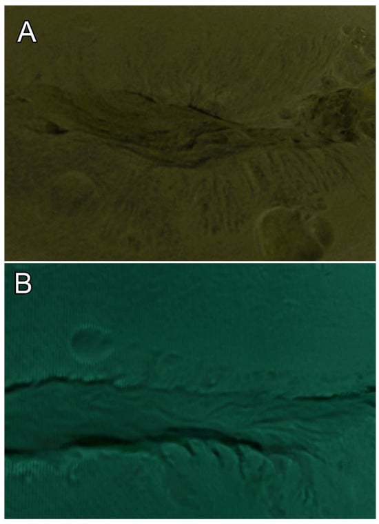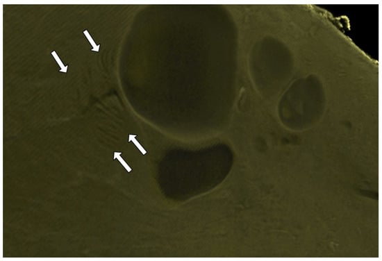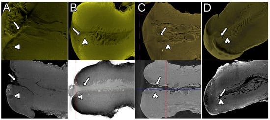 The endocervical epithelium showed different characteristics in the specimens, mostly influenced by the metaplastic transformation. MicroCT images allowed the 3D visualization of the different types of squamocolumnar junctions and the corresponding 3D anatomy of the endocervical epithelium. The epithelium presenting outside the external os has a “grape” appearance. This appearance is created by the compressed folds of the epithelium, forcing the epithelium in a parallel direction with its outermost extremity of polypoid epithelium, creating the “grape” appearance visualized in colposcopic examinations (arrow, Figure 5A). The epithelial folds represent a thick portion of the external os (arrowhead, Figure 5A). This interesting pattern of parallel folds can be seen as metaplasia progresses. However, there is a significant reduction in the number of epithelial folds and their thickness (Figure 5B). The epithelium becomes scarce, and the stroma occupies the external os of the UC (Figure 5C). In the final stage of metaplasia, there is no visible cervical endothelium on colposcopic examination. The portio vaginalis is completely covered by metaplastic squamous epithelium. The columnar epithelium lost its thickness and some folds with a cobblestone appearance were visible in 2D and 3D images (Figure 5D).