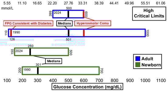 Figure 1 and Figure 2 summarize significant changes in glucose. The low median critical limit for adult glucose (50 mg/dL) remains below the 54 mg/dL threshold for neuroglycopenic symptoms as recommended by the American Diabetes Association (ADA) [14] and is still below the threshold for hypoglycemia [14]. A total of 6 hospitals of the n = 54 dataset reported low critical limits of 54 mg/dL. Six additional hospitals listed low critical limits of 55 mg/dL or higher. The high critical limit for glucose (500 mg/dL) is above the 110 mg/dL threshold for fasting plasma glucose measurement consistent with diabetes [15] and lower than the 600 mg/dL threshold associated with hyperosmolar coma [16]. The ranges for both low and high critical limits for adults narrowed.