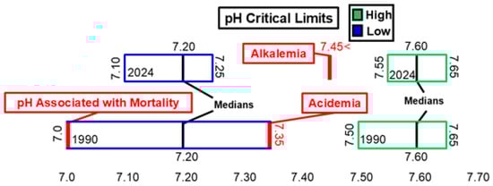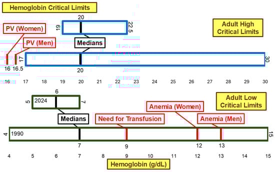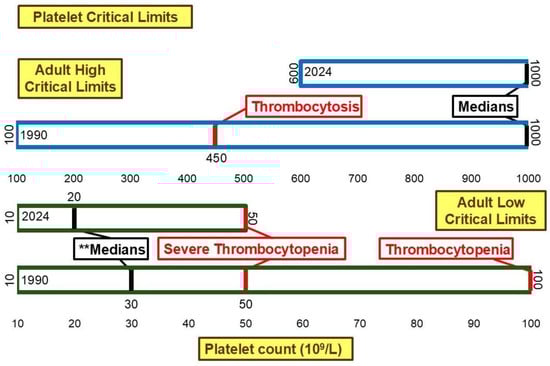 Figure 5 illustrates hemoglobin critical limits. Neither the low median critical limit nor the high median critical limit changed significantly between 1990 and 2024. The low median critical limit changed from 7 g/dL to 6 g/dL, and the range narrowed from 4 g/dL–15 g/dL in 1990 to 5 g/dL–7 g/dL in 2024. This is a shift away from the following clinical thresholds: 9 g/dL associated with a need for transfusion [21], 12 g/dL associated with anemia in women [21,22], and 13 g/dL associated with anemia in men [21,22]. The high critical limit range narrowed from 17 g/dL–30 g/dL to 19 g/dL–22.5 g/dL. However, the medians remained 20 g/dL. This is higher than the 16 g/dL and 16.5 g/dL [23,24,25] thresholds associated with the diagnosis of polycythemia vera in women and men, respectively.