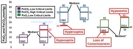 Figure 3 and Figure 4 illustrate changes in arterial pH, arterial pCO2, and arterial pO2 critical values. Between 1990 and 2024, the ranges for both low and high critical limits for arterial pH narrowed. However, neither the low nor high critical limit for arterial pH showed significant differences during this time frame. The median critical limits for low and high arterial pH remained consistent across 1990 and 2024. The low median critical limit was higher than the 7.0 pH threshold associated with mortality [17] and lower than the 7.35 pH threshold associated with acidemia [18]. The high median critical limit was higher than the 7.45 pH threshold associated with alkalemia [18]. The low and high median critical limits for arterial pCO2 and low median critical limit for arterial pO2 did not change between 1990 and 2024. However, the distribution of raw data for these critical limits did change significantly within this timeframe. The low critical limit for arterial pCO2 (20 mmHg) was lower than the 35mmHg threshold associated with hypocapnia [19]. The high median critical limit for arterial pCO2 (70 mmHg) was higher than the 45 mmHg threshold for hypercapnia [20]. The low median critical limit for arterial pO2 (40 mmHg) was higher than the 30 mmHg measurement associated with loss of consciousness [20] and lower than the 60 mmHg threshold associated with hypoxemia [20].