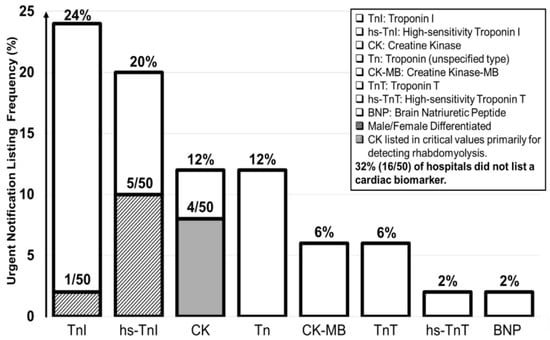 While six hospitals listed CK as a cardiac biomarker, four hospitals used it specifically to diagnose rhabdomyolysis. CK is less sensitive than other listed tests, such as troponin, in detecting cardiac muscle damage [46]. Reserving CK as a tool for monitoring muscle damage, such as in cases of rhabdomyolysis, is recommended due to its sensitivity and specificity in indicating severe muscle damage [47,48]