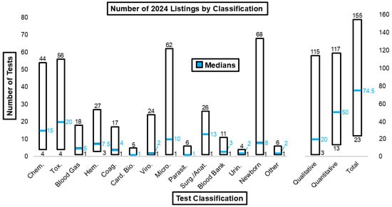 The variability in the number of listed tests across different categories, including chemistry, toxicology, microbiology, newborn screening, and both qualitative and quantitative tests, is notably wide. This wide range can lead to inconsistencies in patient care and inefficiencies in treatment delivery [49]. Collaboration between medical centers aimed at reaching a consensus on standardized lists of tests could significantly enhance efficiency, cost-effectiveness, and the overall quality of patient care [9].