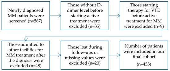 In this retrospective cohort study, we evaluated patients diagnosed and treated due to MM in three facilities between 2019 and 2023 in Bursa, Türkiye. Patients with another type of cancer, those with missing data, or those not receiving treatment for active MM were excluded from our analysis. The data were obtained from the electronic medical records and files of the patients in the hospital. A total of 567 patients were screened in our study, and the patients with no D-dimer value before receiving active treatment for MM, those starting the therapy for VTE before receiving treatment for MM, those admitted to other facilities for the treatment after the diagnosis, or those lost during the follow-ups were also excluded from the criteria. Therefore, a total of 455 patients were included in our analysis. A detailed flow diagram of the patient’s selection process is highlighted in Figure 1. VTE was defined as having symptomatic or incidental, new or recurrent, PE, proximal or distal lower extremity DVT, or proximal or distal upper extremity DVT.