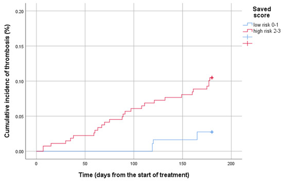 Cumulative incidence of the 6th month thrombosis by the SAVED score.