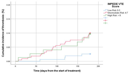 Cumulative incidence of 6th month thrombosis by the IMPEDE VTE score.