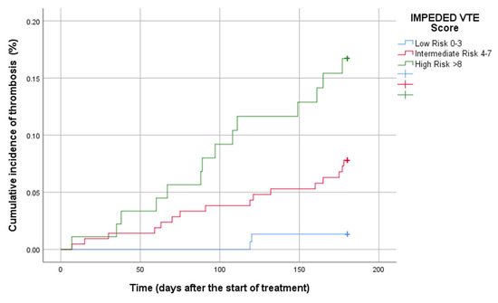 Cumulative incidence of the 6th month thrombosis by the IMPEDED VTE score.