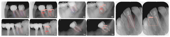 Mask R-CNN studies underline its reliability in segmentation and anomaly detection. Wang et al. (2024) integrated Mask R-CNN with a neural network classifier for diagnosing periapical diseases, achieving a pixel accuracy exceeding 97% [27]. An attention-enhanced Mask R-CNN achieved 79.5% accuracy [28], similar to the accuracy observed in our FEI detection. Other studies reported 75–80% accuracy in identifying dental caries and periodontitis, highlighting its utility in dental radiographic analysis [29,30]. For FEI detection in PAs, Mask R-CNN achieved 98.8 mAP, 95.2% accuracy, and 97% F1 scores, closely aligning with our findings [5]. Furthermore, it demonstrated 100% accuracy and 97.49 mAP in tooth segmentation and numbering, underscoring its precision and clinical applicability [17].