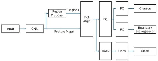 Flowchart of Mask R-CNN architecture. CNN extracts feature maps from the input image. The Region Proposal Network generates candidate regions, which are processed through RoI (Region of Interest) Align to ensure accurate spatial alignment. The extracted features are passed through FC (Fully Connected) layers for classification and bounding box regression. Additionally, Conv (Convolutional) layers are used for mask prediction.