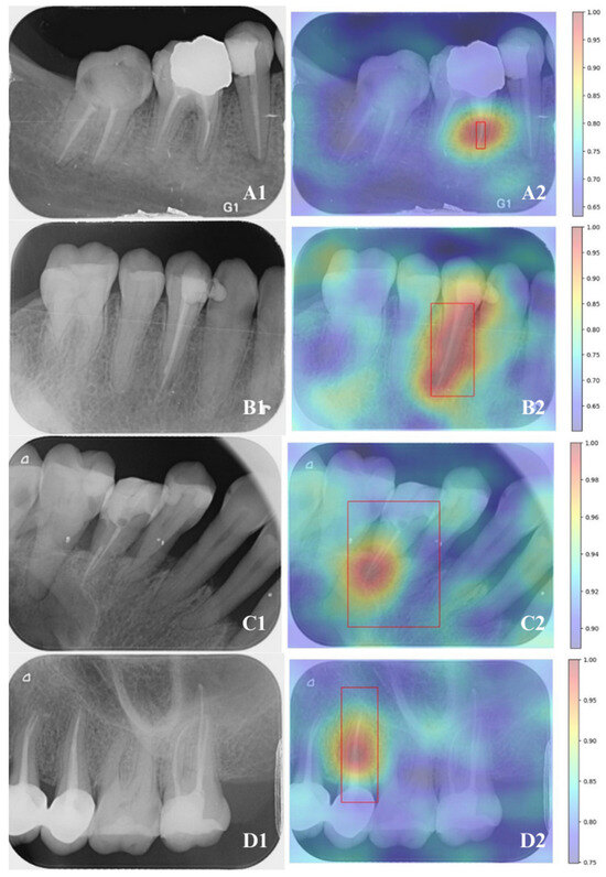 Saliency map outputs for FEI and RCT detection using YOLO and Mask R-CNN. (A1–D1) Raw periapical radiographs, (A2–D2) corresponding saliency maps. (A) YOLO-based saliency map for FEI detection, (B) YOLO-based saliency map for RCT detection, (C) Mask R-CNN-based saliency map for FEI detection, and (D) Mask R-CNN-based saliency map for RCT detection. The red boxes indicate the regions identified by the models as containing FEI or RCT, highlighting the areas of interest detected by the respective deep learning approaches.