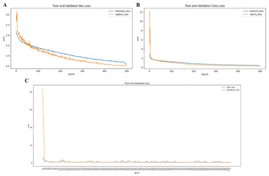 YOLO v8—Class Loss: Class loss decreased rapidly during training, reflecting improved accuracy in classifying objects. The alignment of training and validation losses demonstrated the model’s robustness and reduced likelihood of overfitting in classification tasks (Figure 5B).