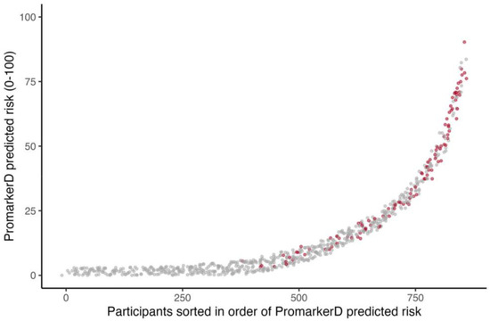 Individual participants ordered by increasing PromarkerD risk score (abscissa) plotted against the magnitude of the score (ordinate). The participants represented by grey dots did not develop the primary endpoint and those represented by red dots did. Jittering is applied to improve the visualization of overlapping points.
