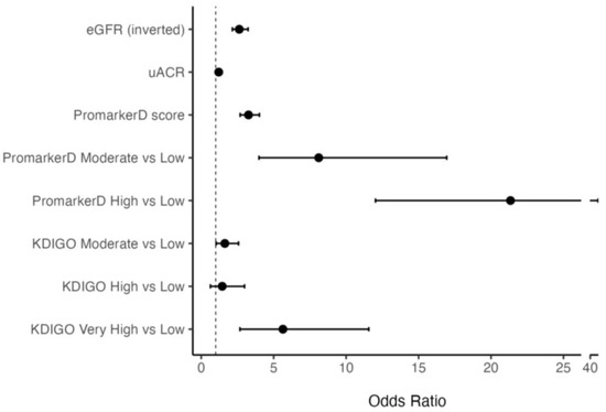 Higher PromarkerD scores were associated with greater odds of future renal function decline compared to eGFR and uACR (see Figure 2). Specifically, each 1 standard deviation (SD) increase in PromarkerD score was associated with an odds ratio (OR) of 3.26 (95% CI 2.69–4.02). The ORs per 1 SD increase for eGFR and uACR were lower at 2.63 (2.15–3.24) and 1.21 (1.04–1.42), respectively. Participants classified as moderate and high risk by PromarkerD had significantly higher odds of experiencing the primary study endpoint compared to those at low risk (OR 8.11 (3.99–16.94) and 21.34 (12.03–40.54), respectively, both p < 0.001). KDIGO risk categories showed variable and more modest degrees of association with the OR for moderate versus low risk at 1.86 (1.18–2.92), high versus low risk at 1.28 (0.51–2.81), and very high versus low risk at 6.70 (3.14–13.99).