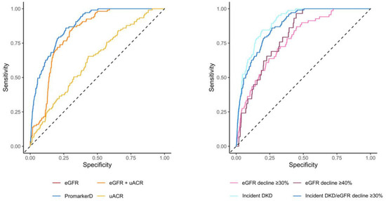 Areas under the curve (AUC) of the receiver operating characteristic for PromarkerD, eGFR, uACR, and eGFR + uACR in predicting the primary renal outcome (left-hand panel) and for PromarkerD in predicting primary and secondary outcomes (right-hand panel). The dashed diagonal line represents the line of no discrimination (AUC = 0.5). In the left-hand panel, the curves for eGFR and eGFR + uACR were colinear and so only the eGFR curve is shown.