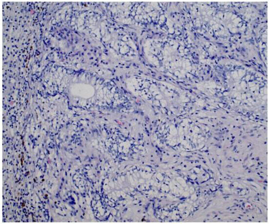 HE image showing pleural fibrous tissue infiltrated by clear cell adenocarcinoma (positive for panCK, AR and AMACR, negative for TTF1, not shown). Magnification: 20×.