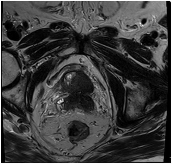 MR T2 weighted-images—axial plane, extensive infiltration of the gland with involvement of the seminal vesicles—T3b.