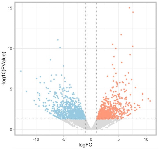 A volcano plot of differential gene expression patterns of the EClop53ab group versus the EChi group to identify specific genes that fit the threshold criteria (p-value < 0.05 and logFC ≥ 1 or ≤−1). The differentially expressed genes (DEGs) are shown in blue (downregulated) or red (upregulated).