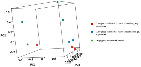 Principal component analysis (PCA): A plot of the first three principal components (PC1, PC2, and PC3). In the PCA, the EClop53ab group was more similar to the EClop53wt group than to the EChi group (red squares: low-grade endometrial cancer with wild-type p53 expression, blue squares: low-grade endometrial cancer with abnormal p53 expression, and green squares: high-grade endometrial cancer).