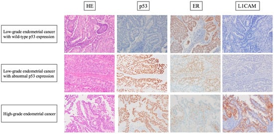 - Yano, M.; Ito, K.; Yabuno, A.; Ogane, N.; Katoh, T.; Miyazawa, M.; Miyazawa, M.; Hasegawa, K.; Narahara, H.; Yasuda, M. Impact of TP53 immunohistochemistry on the histological grading system for endometrial endometrioid carcinoma. Mod. Pathol. 2019, 32, 1023–1031. [Google Scholar] [CrossRef] [PubMed]