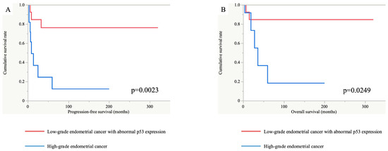 Abnormal p53 expression is a rare finding in low-grade endometrial cancer, being reported in 2–15% of cases [3,4,5,6,7,8,9,10,11,12]. In our previous study, we reported that abnormal p53 immunohistochemical expression was not an independent prognostic factor when confined to endometrioid carcinoma, G1 [13]. Meanwhile, Puppo et al. demonstrated conflicting findings that low-grade endometrial cancer patients with abnormal p53 expression seem to be at a greater risk of recurrence [12]. When molecular classification is applied to low-grade endometrial cancer, there is a possibility that adjuvant therapy may be modified for the abnormal p53 group. However, there is still insufficient evidence to support this. The question of whether to evaluate p53 expression in all cases of low-grade endometrial cancer also warrants further investigation. Against this background, we conducted the present study to reveal the clinical significance of abnormal p53 immunohistochemical expression in low-grade endometrial cancer.